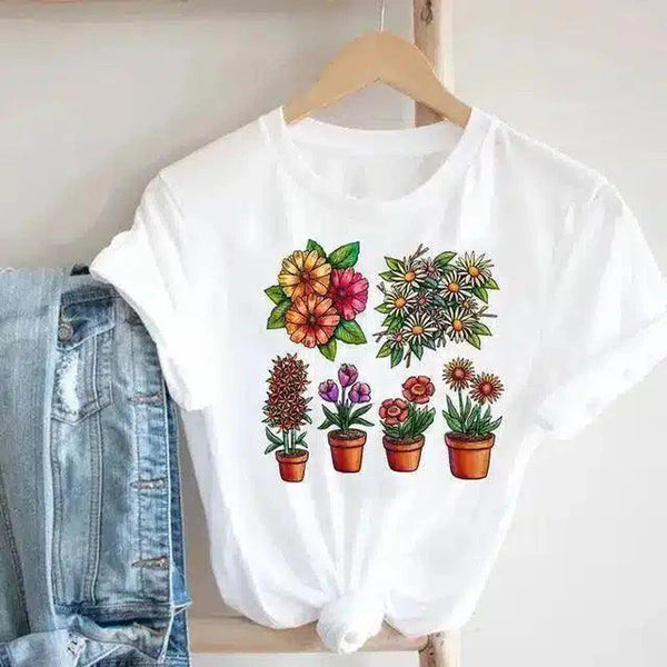 T-shirt imprimé de fleurs en pot pour une tenue décontractée