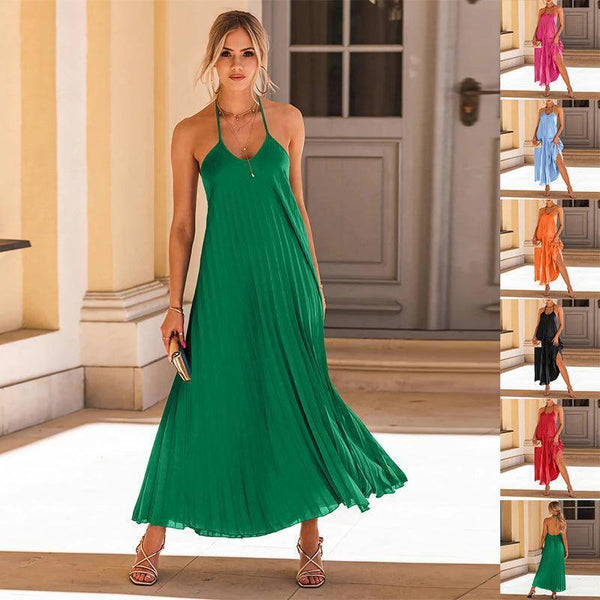 Fashion A-line Pleated Suspender Long Dress Summer Casual
