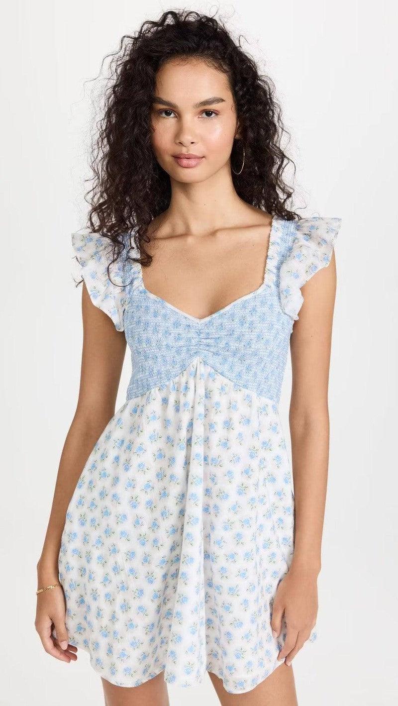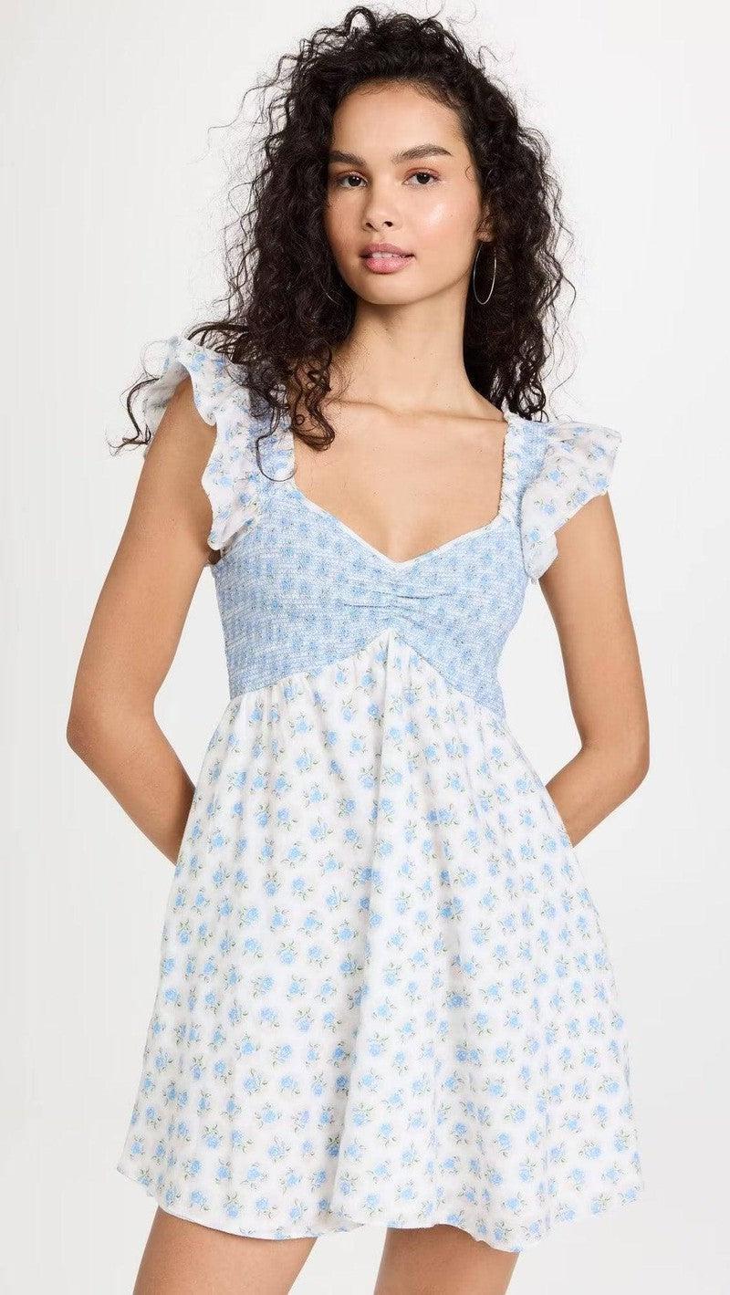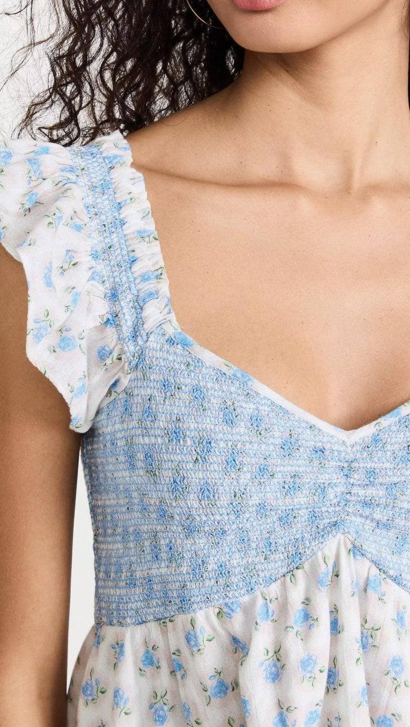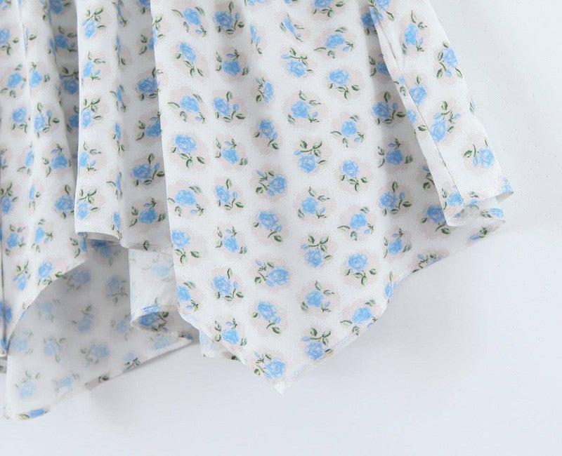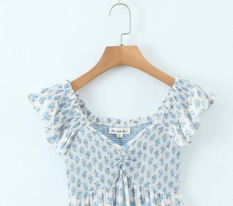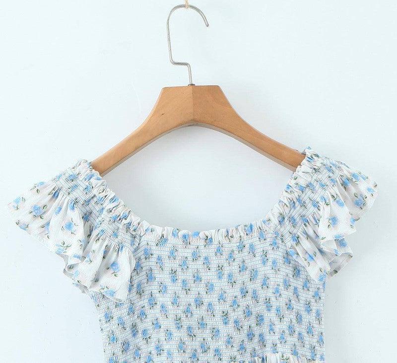 Robe ample élastique à petites fleurs bleues style vacances à la française