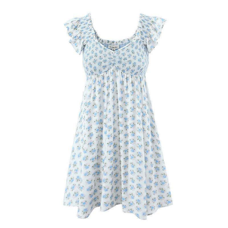Description du produit : Robe ample élastique à petites fleurs bleues style vacances françaises