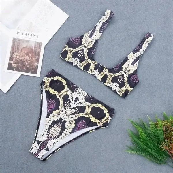 - Design:Ensemble de bikini deux pièces avec un imprimé animalier stylisé.