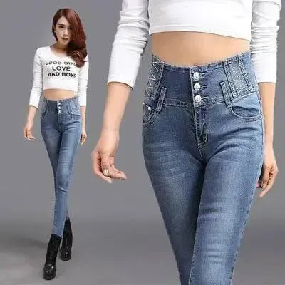 nouveau jeans stretch à taille haute et à boucle pour femmes Coréen