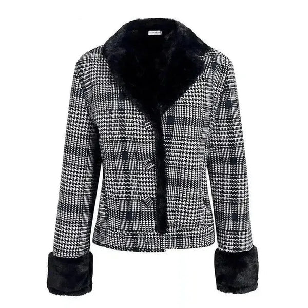 Manteau pied-de-poule avec bordures en fausse fourrure