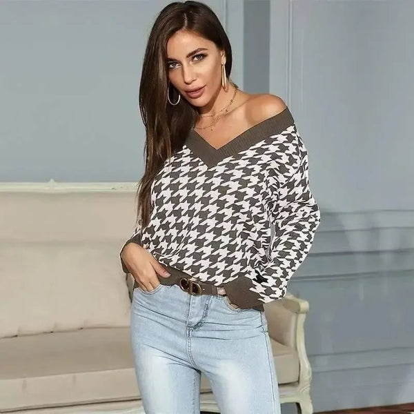 Women Long-Sleeve Houndstooth Jacquard V-Neck Base Knitted