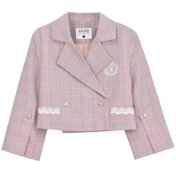 - Détails de conception : Fermeture à double boutonnage, poches ornées de dentelle, motif à carreaux