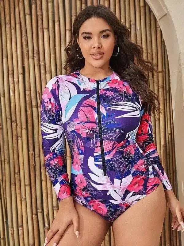 Les maillots de bain une pièce de taille plus pour dames, manches longues imprimées.