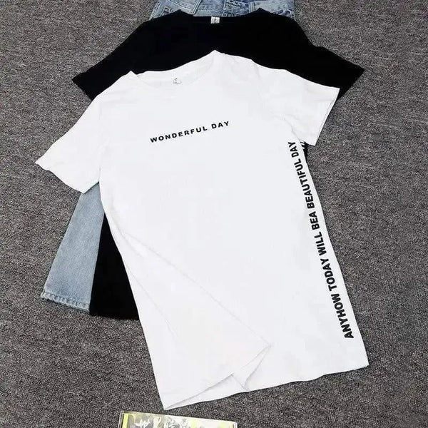 - Message inspirant : le message "WONDERFUL DAY" imprimé sur la poitrine ajoute une ambiance positive, tandis qu'un texte plus long longeant la couture latérale apporte un élément de design inattendu.