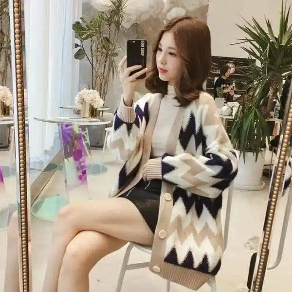 - Détails de conception: Motif géométrique audacieux, couleurs contrastées, fermeture à bouton sur le devant