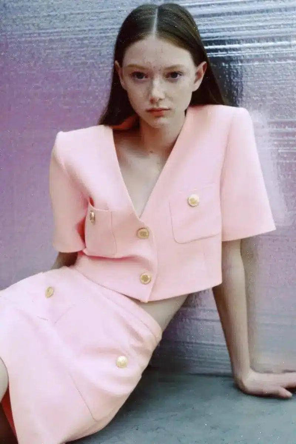 - Détails Détails: Accents de boutons dorés et poches avant sur le haut et la jupe