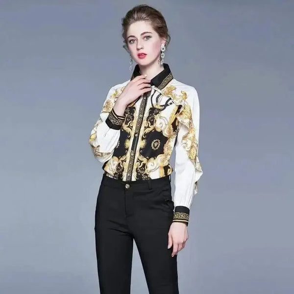 Retro Palace Print Ruffled Slim-fit Fashion Print Shirt