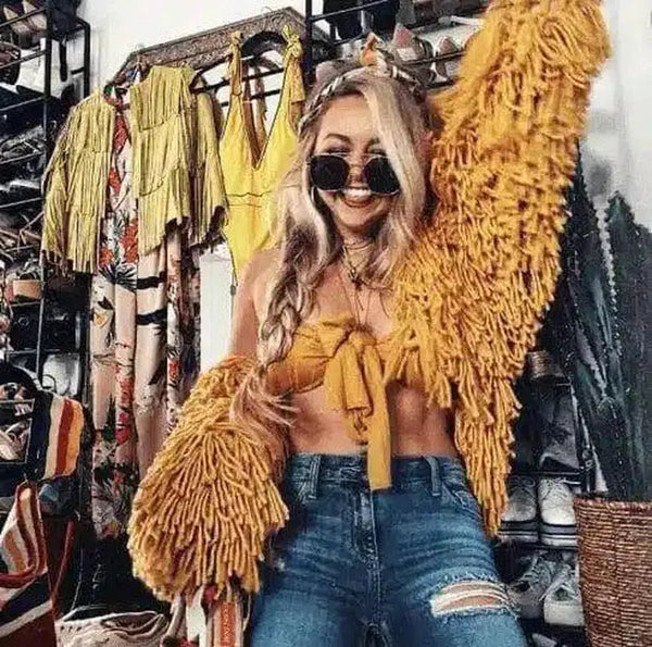 - Type de vêtement: Cardigan à franges et crop top à nouer