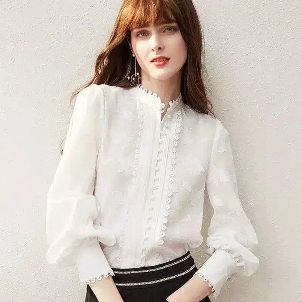 - Bords festonnés délicats - Les manches et le col sont finis avec des bords festonnés, contribuant à l'aspect complexe et poli de la blouse.