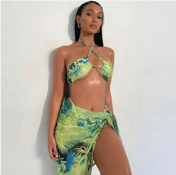 Minijupe trois pièces imprimé enveloppant poitrine dos nu gilet minijupe