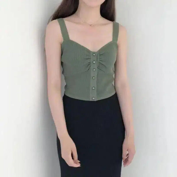 - Détails de boutons uniques : Ce haut est orné d'une ligne de boutons décoratifs sur le devant, ajoutant une touche vintage à son style contemporain.