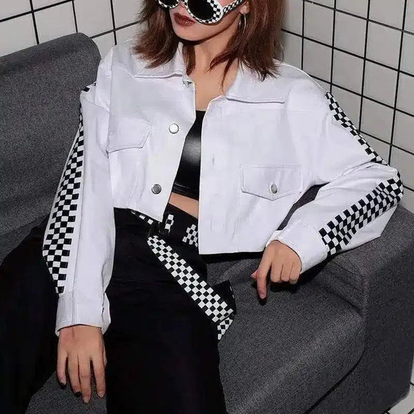 - Détails de conception : Motif en damier sur les manches et la ceinture ; fermeture à boutons sur le devant ; poches à rabat sur la poitrine
