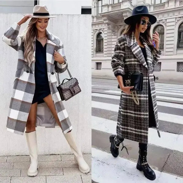 Manteau mi-long à carreaux Manteau en laine à revers et cravate