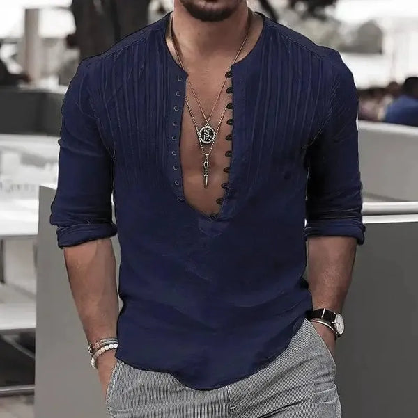 Chemise décontractée à col rond en coton et à boutons pour hommes