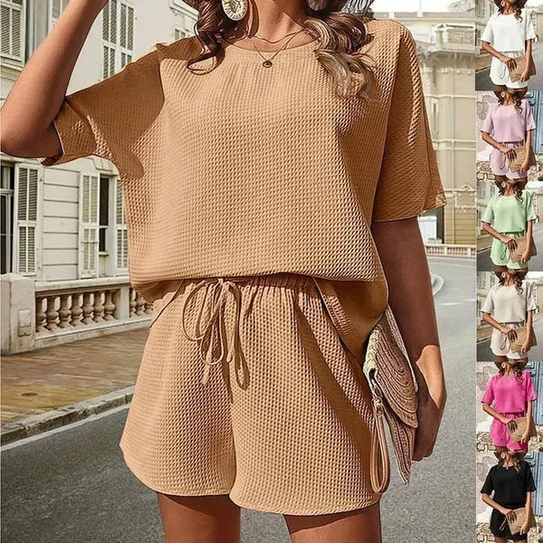New Waffle Suit Women's Bat Sleeve Short-sleeve Crew-neck Top And Drawstring Design Shorts Fashion Two-piece Set Summer Clothing