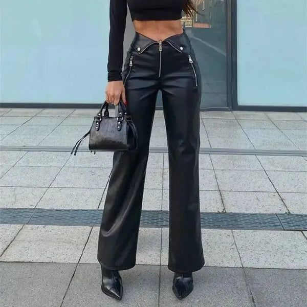 Pantalon taille haute, droit, ample et décontracté, en cuir