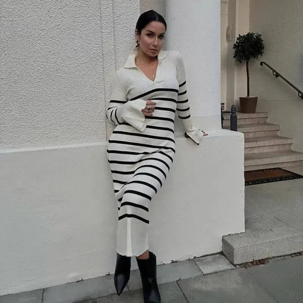 Robe à manches longues en tricot pour femmes, avec un col profond en V