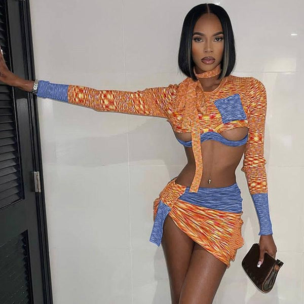 Tricoté Manches longues Top cropped Jupe slim Tailleur