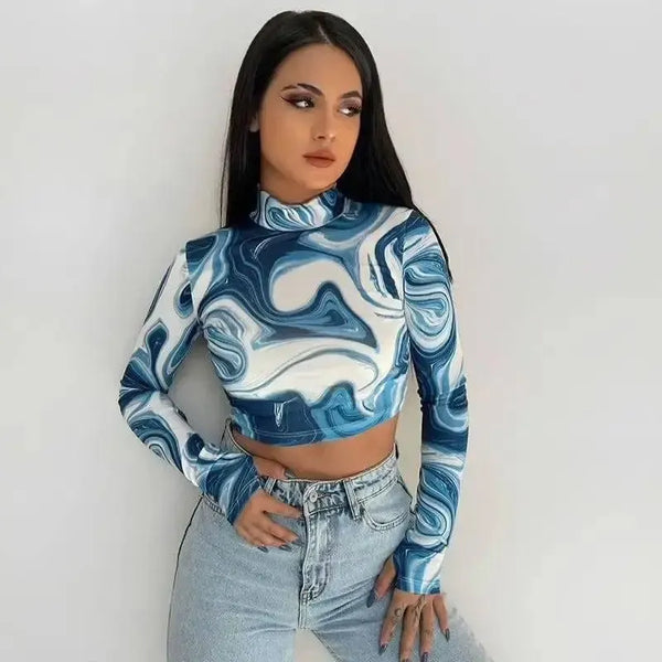 Imprimé Half Turtleneck Pullover Crop Finger Sleeve Top