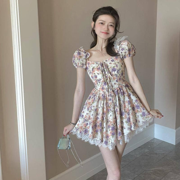 Robe à manches courtes en dentelle française à manches bouffantes pour femmes