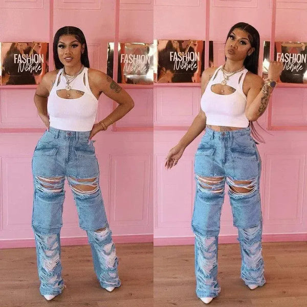 - Style : Jeans déchirés droits à fermeture éclair taille haute pour femmes